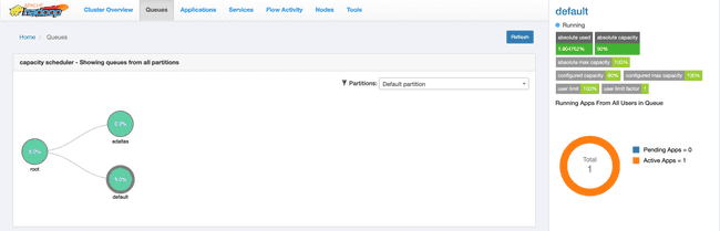 The Queues page displays details of YARN queues. You can either view queues from all the partitions or filter to view queues of a partition.